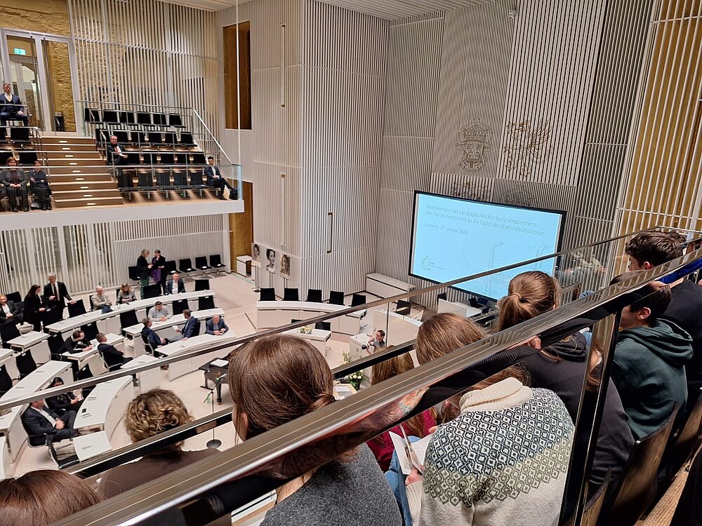 Am 27. Januar 2026 nahmen Schülerinnen und Schüler der Klassenstufe 10 am Gedenkkonzert des Landtages Mecklenburg-Vorpommern anlässlich des Tages des Gedenkens an die Opfer des Nationalsozialismus teil. Die Veranstaltung fand im Plenarsaal des Schweriner Schlosses statt.