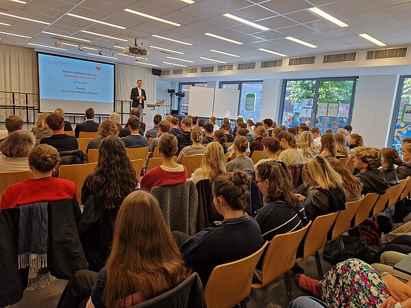 Nach inhaltlichen Vorbereitungsgruppen mit zentralen Fragestellungen zum Thema „Geschlechtergerechtigkeit“ stimmte auch der Schulleiter Paul Zehe die Teilnehmenden mit den Worten aus dem Brief des Apostels Paulus an die Galater: „Hier ist nicht Jude noch Grieche, hier ist nicht Sklave noch Freier, hier ist nicht Mann noch Frau; denn ihr seid allesamt einer in Christus Jesus." (Kapitel 3, Vers 28) auf die intensive Beschäftigung mit dem Thema ein. Nach dieser Mahnung an die Einheit und Gleichheit aller Menschen durch den Glauben an Jesus Christus - unabhängig von ihrer Herkunft, ihrem sozialen Status oder ihrem Geschlecht – widmeten sich dann die folgenden drei Impulsvorträge von Prof. Dr. Guido Hölker (Wirtschaftswissenschaftler an der Hochschule Wismar), Propst Dr. Georg Bergner (Pfarrer der Pfarrei St. Anna Schwerin) sowie Dr. Birgit Stammberger (wissenschaftliche Mitarbeiterin am Institut für Medizingeschichte und Wissenschaftsforschung der Universität zu Lübeck) mit unterschiedlichen inhaltlichen Zugängen und Schwerpunktsetzungen dem Thema „Geschlechtergerechtigkeit“.