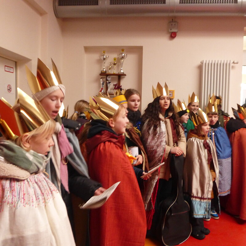 Vor Ort sangen die „Könige“ das Lied „Wir kommen daher aus dem Morgenland, wir kommen geführt von Gottes Hand. …“. Danach wurden kurze Texte vorgetragen bevor der eigentlich Segen erfolgte und in einer Segensformel an Türen geschrieben oder geklebt wurde. Gleichzeitig sammelten die Schüler*innen Geld für das Kindermissionswerk „Die Sternsinger“. In diesem Jahr steht die Sternsingeraktion unter dem Motto „Schule statt Fabrik  – Sternsingen gegen Kinderarbeit“. Weltweit müssen 138 Millionen Kinder zwischen 5 und 17 Jahren arbeiten. 54 Millionen Kinder unter besonders gesundheitsgefährdenden und ausbeuterischen Bedingungen.