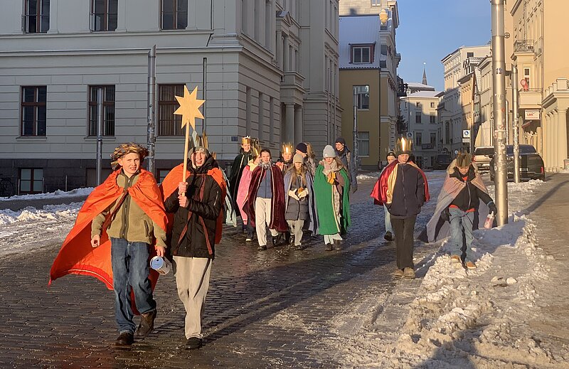 Mit Gewändern und in der Sonne glitzernden Kronen zogen die Gruppen, angeführt durch einen Sternträger, der ihnen, wie der Stern über dem Stall den Weisen bei der Geburt Christi, den Weg wies. Begleitet wurden sie dabei jeweils von älteren Schüler* sowie Lehrer*innen.