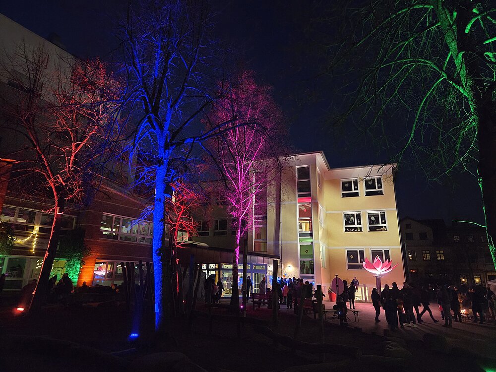 Besondere Attraktionen waren die eindrucksvollen Lichtinstallationen, die die Bäume und den gesamten Schulhof erstrahlen ließen, sowie eine leuchtende Blume und zahlreiche Lichterketten, die für eine zauberhafte Atmosphäre sorgten.
